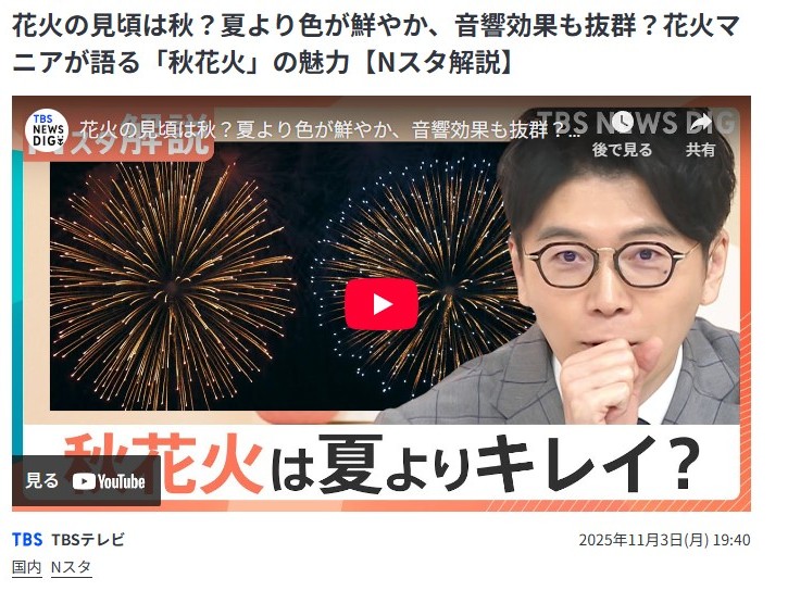 TBS Nスタにて、秋川流域花火大会が紹介されました!特集名は「花火の見頃は秋?夏より色が鮮やか、音響効果も抜群?花火マニアが語る「秋花火」の魅力【Nスタ解説】」。空気が澄んでいて、音も光もキレイと言われる「秋の花火大会」として、本大会が紹介... -